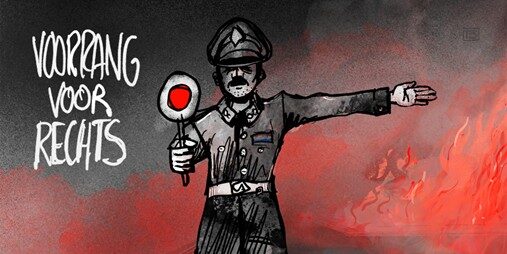 ‘Voorrang Voor Rechts‘ comes out 10 days before the Dutch General Election on 29th October, with Wilders’ extreme right PVV aiming to become the biggest party. Wilders and Baudet supporters, demonstrating against refugees, cause violence all over the Netherlands.