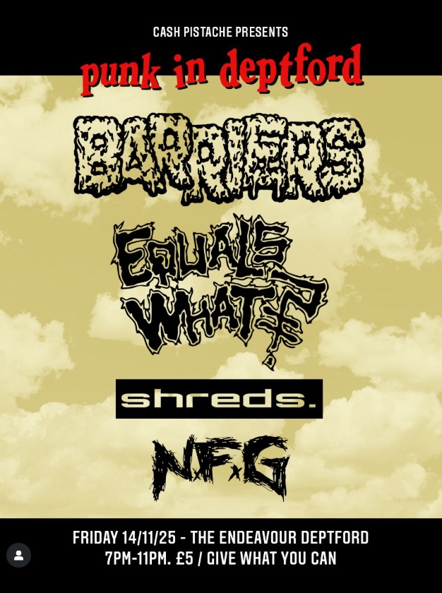 We’ve got a Brighton show in October with Barriers, at the Cowley Club, opening for a crust band called Barren, and then we’ll be starting to record. We’ve got about five tracks that we’ve been playing live, and we’re pretty confident that we’re good to go in terms of recording them. Then we’ve got two shows with Equals What? – one in London at Deptford Endeavour on Friday 14th November, and then another the next day in Brighton as part of an all-dayer at Daltons.