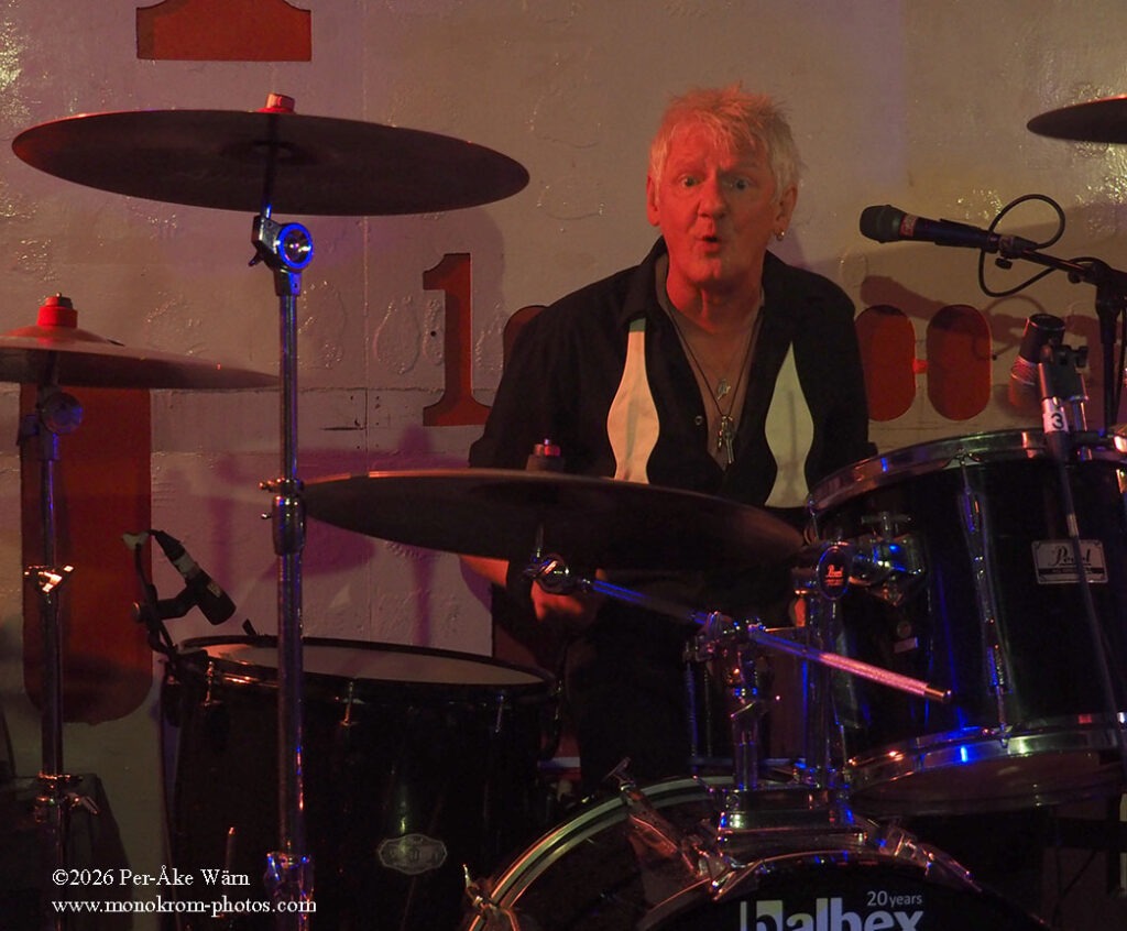 Guitarists Richie and Paul throw an assortment of crazy shapes as their rockin’ and rollin’ riffs blast around the room. Jon on bass is just as impressive, playing both lead and rhythm with consummate professionalism. Entertaining us with a colossal 19 songs in the main set is no mean feat, the sweat upon each musicians’ brow testament to how hard they are working.. They’re having fun though, and so are we! Hilarious quote of the evening from Peter; “If anyone has been affected by the issues raised in the last song, please go to www.gofuckyourself.com, where help is available.”