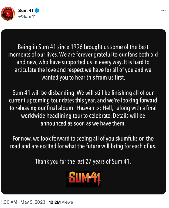 Sum 41 has promised to fulfill all of their existing tour dates before releasing their final album and embarking on their last global tour. The band members are excited about their future plans and hope to see their fans on the road. “Thank you for the last 27 years of Sum 41,” they added.