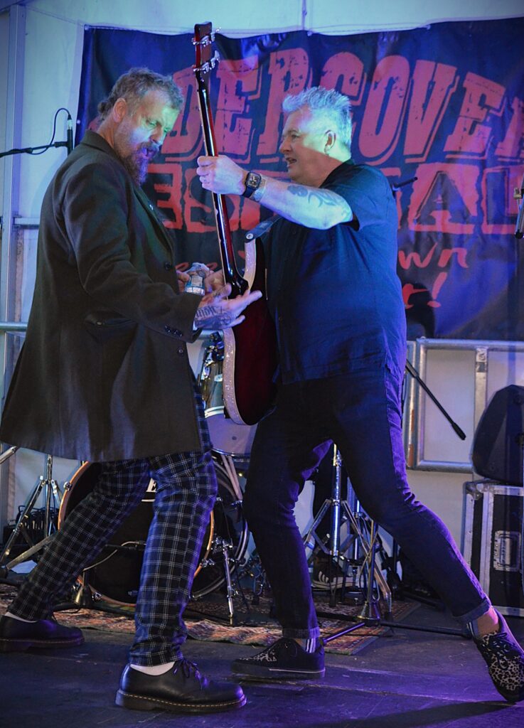 Bringing a bit of culture to the Den stage were punk poet / guitar maestro duo Cherry & Peesh. Starting with crowd favourite ‘Punk Mum‘, then Cherry B’s “I can write a revenge song” ‘Married To The Mod‘, the highly entertaining pair got topical with ‘Trump Card‘, an older number which has had to be resurrected due to recent events, then Cherry B’s ode to her old school cookery teacher, ‘Lady Kokaine‘. Recently invited to perform at the Rik Mayall Comedy Festival, they also included several of their tributes to the ‘People’s Poet‘, from their ‘The Rik ‘N’ Roll Show‘ EP. A biographical cover of ‘The Young Ones‘, a song about Rik’s beastly politician character ‘Alan‘, and ‘The Four Horsemen‘, their tribute to fictional band Bad News, with the audience encouraged to shout out “Fuck off Bad News” during the chourus! Cherry & Peesh ended their fabulous set with ‘Yesterday’s Kids‘, dedicating it to all us festival goers!